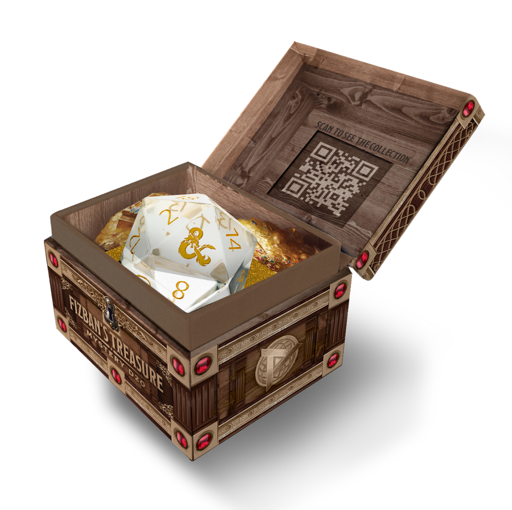 Tout droit sorti des pages du Trésor des Dragons de Fizban, ce coffret surprise renferme un unique dé à 20 faces surdimensionné, inspiré par la puissance et la majesté des dragons. Caché dans un coffre au trésor miniature, chaque dé est une énigme, conçu pour incarner l'essence d'un dragon spécifique issu du vaste et mystérieux savoir de Fizban. Cette collection propose un mélange de matériaux, dont le métal, le noyau liquide, des dés creux et des pierres précieuses !