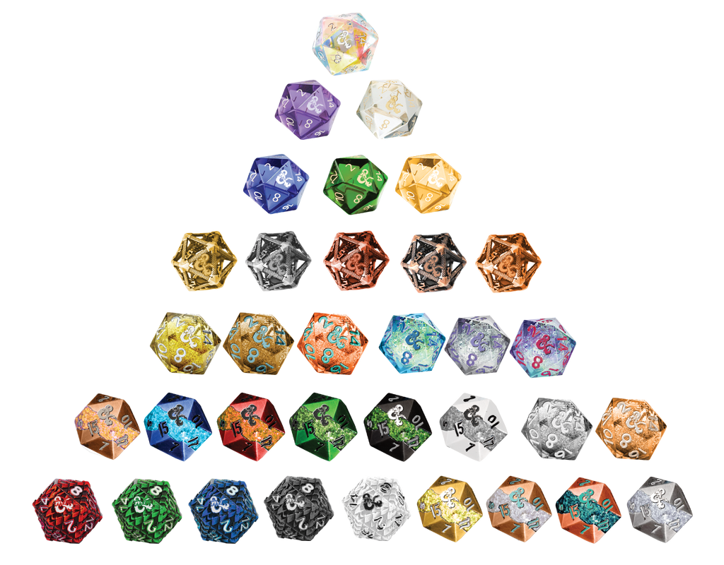 Chaque dé à 20 faces (d20) mesure 25 mm et est forgé à partir de matériaux uniques : pierres précieuses scintillantes, noyau liquide tourbillonnant, métal finement creux ou alliages coulés massifs. Chaque lancer donne l’impression de libérer un pouvoir ancestral.