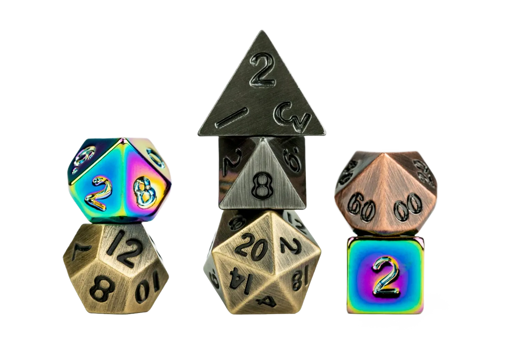 Petits par la taille, mais imposants par leur présence : nos mini dés polyédriques en métal Mystery Misfit offrent une sensation de poids remarquable dans un format de poche. Chaque set complet de 7 dés dépareillés est moulé en métal massif, offrant ce poids et cette résonance si appréciés des joueurs, le tout dans un format mini compact pour un transport facile et des lancers rapides. Appartenant à la gamme « Mystery Misfit », chaque set est une surprise.
