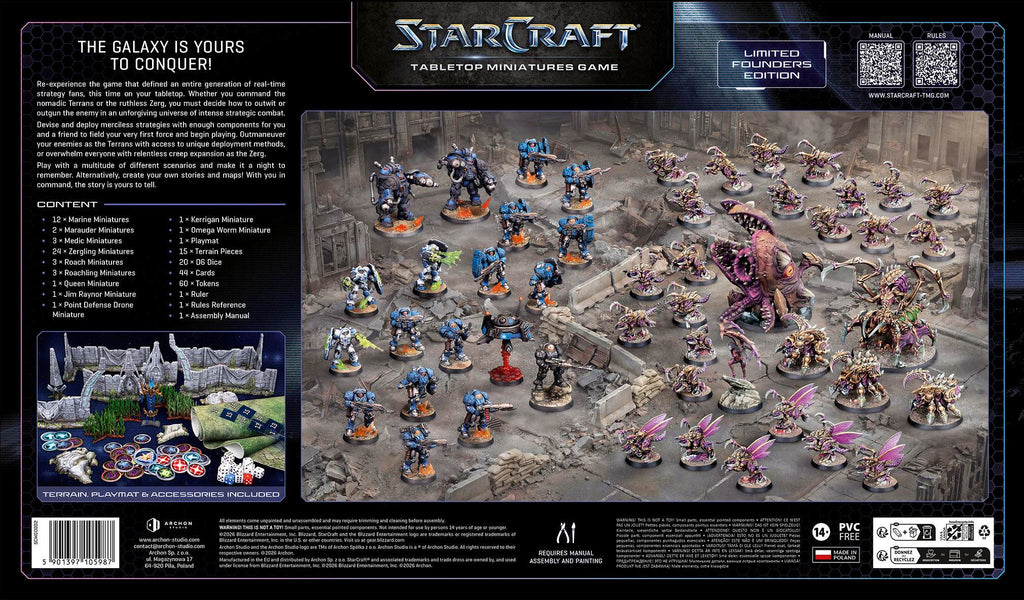 Relive one of StarCraft's most iconic conflicts, this time on your tabletop! This two player starter set lets one side take control of the endless Zerg swarm with Kerrigan - the Queen of Blades at the helm, while the other side plays as the adaptive Terrans, with rebel leader Jim Raynor in control. Build your army and fight for control over key objectives, as every action leaves lasting consequences for the future of the Koprulu sector!