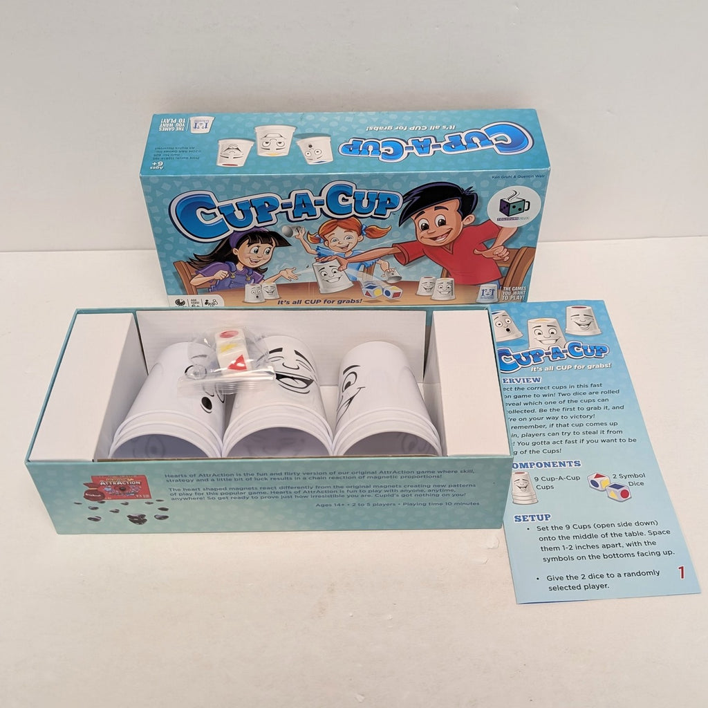 Fast hands and quick minds think alike! It's all cup for grabs as players race to catch the cups in this fun family game. Roll the dice, quickly identify the missing colored shape, then try to be the first to grab the matching cup off the table. But be careful ... no cup is safe! On the next player’s turn, if another player holds the matching cup, anyone can grab it to complete the set. First to collect three cups wins.
