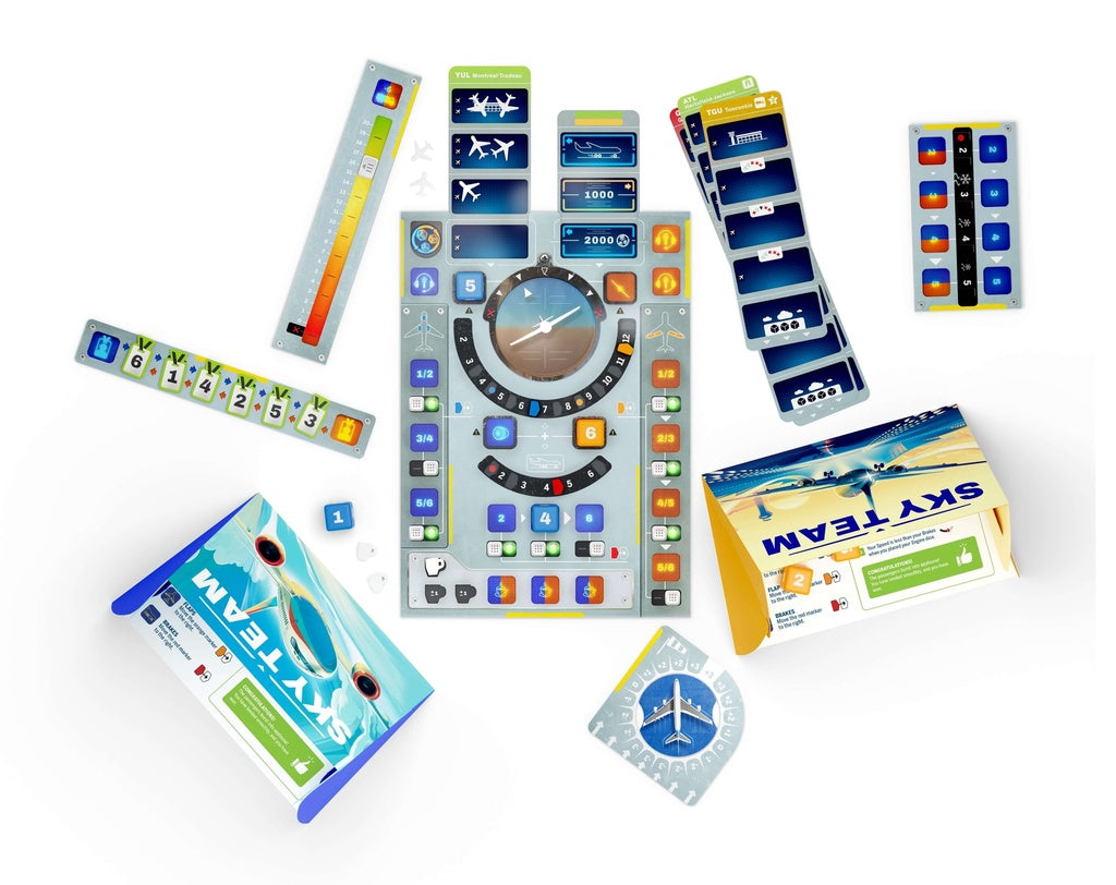 Sky Team is a cooperative limited-communication game, exclusively for 2 players, where you play a pilot and co-pilot at the controls of an airliner. Your goal is to work together as a team to land your airplane in different airports around the world. Silently assign your dice to the correct spaces in your cockpit to balance the axis of your plane, control its speed, deploy